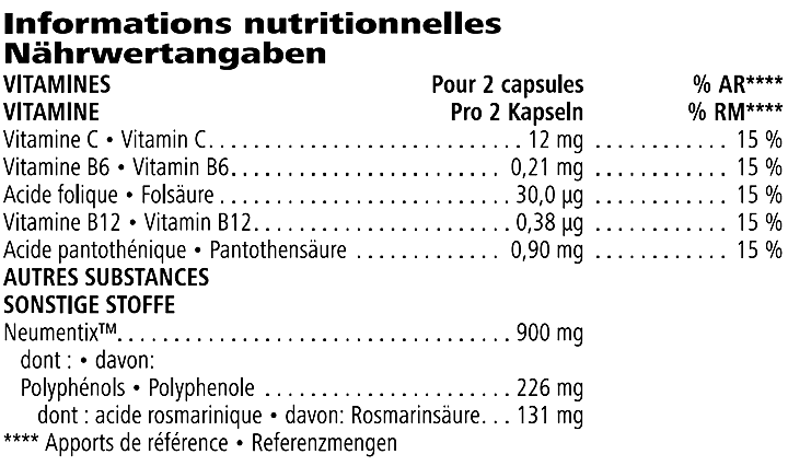 Neumentix™ Extrakt aus den Oberirdischen Teilen der Grünen Minze (Mentha spicata L.), Kapselhülle (Hydroxypropylmethylcellulose, Farbstoff (Kupferkomplexe der Chlorophylline)), Füllstoffe (Calciumphosphate, Mikrokristalline Cellulose), Vitamin C, Trennmittel (Magnesiumsalze der Speisefettsäuren, Siliciumdioxid), Pantothensäure, Vitamin B12, Vitamin B6, Folsäure.  Neumentix™ ist eine Marke von Kemin Industries, Inc.