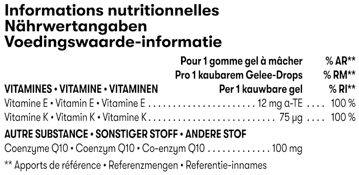 Sonnenblumenöl, Süßungsmittel (Xylit), Wasser, Süßungsmittel (Sorbit), Coenzym Q10 (Ubichinon), Gelatine, Säureregulator (Trinatriumcitrat), Vitamin E (D-alpha-Tocopherol), natürliches Aroma, Säureregulator (Äpfelsäure), Vitamin K2 (Menachinon), Farbstoff (Paprikaextrakt), Süßungsmittel (Steviolglycoside aus Stevia).