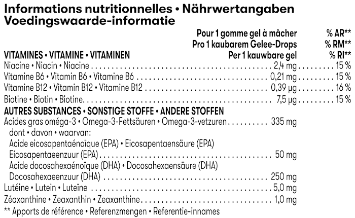 Fischölkonzentrat, Süßungsmittel (Xylit), Wasser, Süßungsmittel (Sorbit), Gelatine, natürliche Aromen, Säureregulator (Trinatriumcitrat), Lutein und Zeaxanthin-Mischung, Säureregulator (Citronensäure), Antioxidationsmittel (Ascorbinsäure), Niacin (Nicotinamid), Süßungsmittel (Steviolglycoside aus Stevia), Vitamin B6 (Pyridoxinhydrochlorid), Vitamin B12 (Cyanocobalamin), Biotin (D-Biotin).