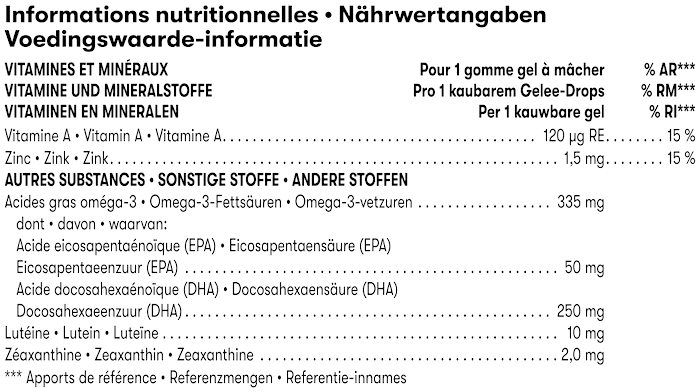 Fischölkonzentrat, Süßungsmittel (Xylit), Wasser, Süßungsmittel (Sorbit), Gelatine, Lutein und Zeaxanthin-Mischung, Säureregulator (Trinatriumcitrat), natürliche Aromen, Säureregulator (Citronensäure), Zinkbisglycinat, Antioxidationsmittel (Ascorbinsäure), Vitamin A (Retinylpalmitat), Farbstoff (Beta-Carotin).