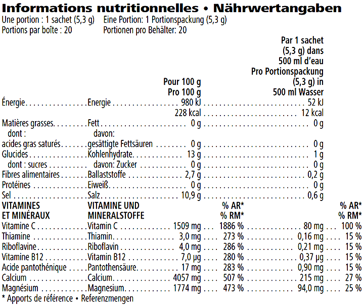 Säureregulatoren (Citronensäure, Dikaliumphosphat), natürliches Orangenaroma, Calciumcarbonat, Trinatriumcitrat, Natriumchlorid, Magnesiumhydroxid, Natrium-L-Ascorbat, Geschmacksverstärker (Kaliumchlorid), Süßungsmittel (Sucralose), Calcium-D-Pantothenat, Thiaminhydrochlorid, Riboflavin, Cyanocobalamin.