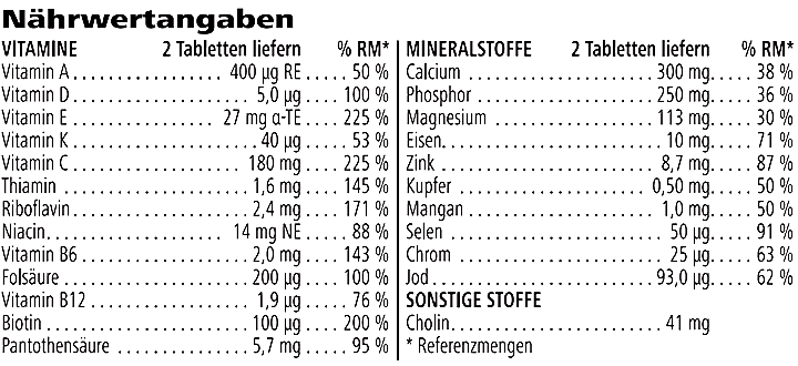 Mischung mit Vitaminen und Mineralien (Dicalciumphosphat, Magnesiumphosphat, L-Ascorbinsäure, Cholinbitartrat, Magnesiumoxid, Calciumcarbonat, DL-α-Tocopherylacetat, Eisenfumarat, Nicotinamid, D-Biotin, Zinkoxid, β-Carotin, Calcium-D-Pantothenat, Natriumselenit, Retinylpalmitat, Mangansulfat, Cholecalciferol, Riboflavin, Pyridoxinhydrochlorid, Pteroylmonoglutaminsäure, Chrom(III)-Chlorid, Pteroylmonoglutaminsäure, Cyanocobalamin, Thiaminmononitrat, Kupfersulfat, Kaliumiodid, Phyllochinon), Füllstoff (Mikrokristalline Cellulose), Tablettenüberzug [Überzugmittel (Hydroxypropylmethylcellulose), Farbstoffe (Calciumcarbonat, Eisenoxidrot), Trennmittel (Speisefettsäuren), Füllstoff (Mikrokristalline Cellulose)], Trennmittel (Vernetzte Natriumcarboxymethylcellulose, Speisefettsäuren, Magnesiumsalze der Speisefettsäuren, Siliciumdioxid), Stabilisator (Polyethylenglycol).
