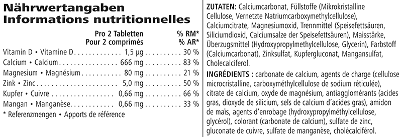 Calciumcarbonat, Füllstoffe (Mikrokristalline Cellulose, Vernetzte Natriumcarboxymethylcellulose), Calciumcitrat, Magnesiumoxid, Trennmittel (Speisefettsäuren, Siliciumdioxid, Calciumsalze der Speisefettsäuren), Maisstärke, Überzugsmittel (Hydroxypropylmethylcellulose, Glycerin), Farbstoff (Calciumcarbonat), Zinksulfat, Kupfergluconat, Mangansulfat, Cholecalciferol.
